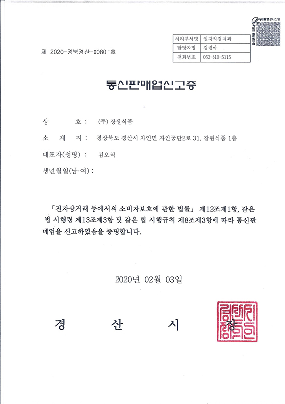 (주)장원식품 | 대표자 : 김오식 | 사업자 등록번호 : 515-81-53309 | 통신판매업신고번호 : 제2020-경북경산-0080호